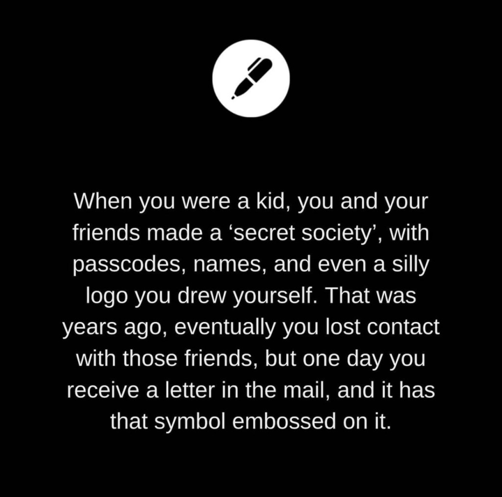 Me bestemde oss for å danne ein slags klubb – eit heimleg selskap med målet å kjempe mot desse kreftene. Det var ikkje noko tvil i det heile teke om at desse kreftene fanst, det var me heilt sikre på. Me var òg minst like sikre på at me fire var dei utvalde, dei som skulle kunne redde verda, heilt utan at noko som helst tydde på det. Som alle andre heimlege selskap me hadde høyrt om, det var viktig å ha eit eige symbol. Etter mykje diskusjon bestemde me på eit flammande sverd omgjeven av ei metallkjede – kanskje litt typisk for ein gjeng med tenåringar, men vi var nøgd med det. Det symbolet begynte å dukke opp overalt: i lærebøkene våre, i bøkene og spela vi lånte til kvarandre, me skulle til og med teikne det på hendene våre. Det blei aldri nokon verkeleg kamp mot mørkerets krefter – me syntest at det rakk til at vi fanst, i tilfelle noko skulle skje.